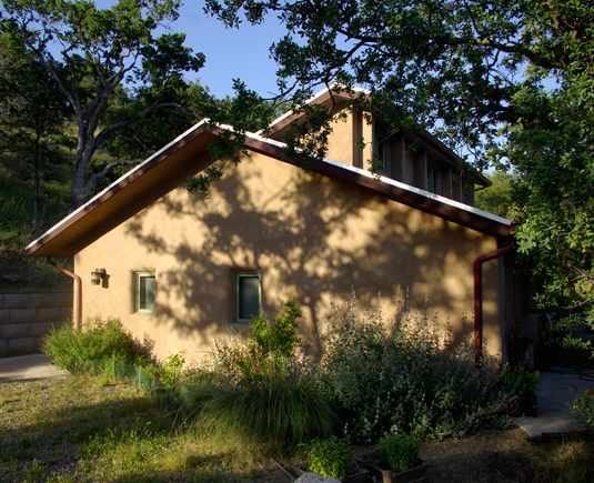 features Straw bale exterior walls with hand troweled stucco exterior finish; passive solar heating system; locally made reclaimed fir cabinets, doors & soffits, recycled denim batt insulation in ceilings; zero VOC finishes on all wood work; integrally pigmented hand troweled clay plaster on interior walls; concrete window sills and exposed concrete floors with pomegranate juice stain.